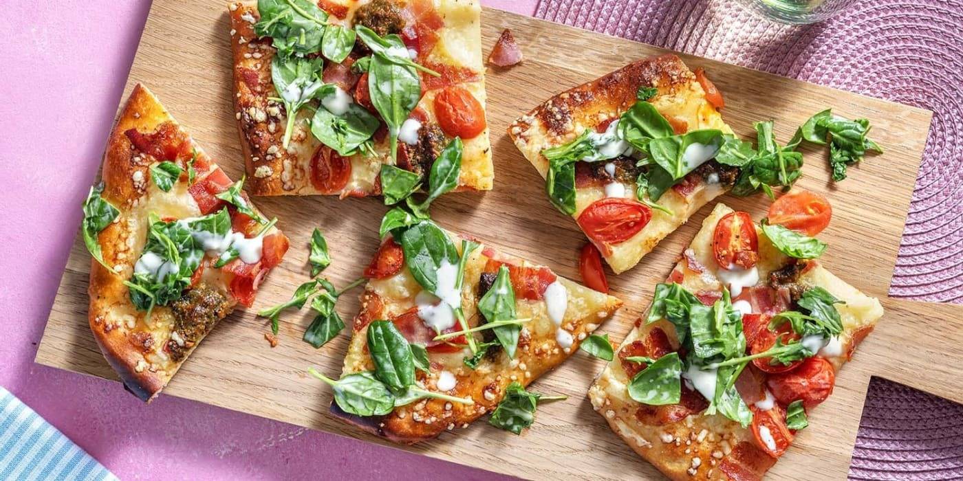 Simply swap the tomato base for garlic dill sauce, bake in a layer of Canadian bacon, then pile on pickles and mozzarella cheese. This choice is bound to shake up taste buds and get tongues wagging.